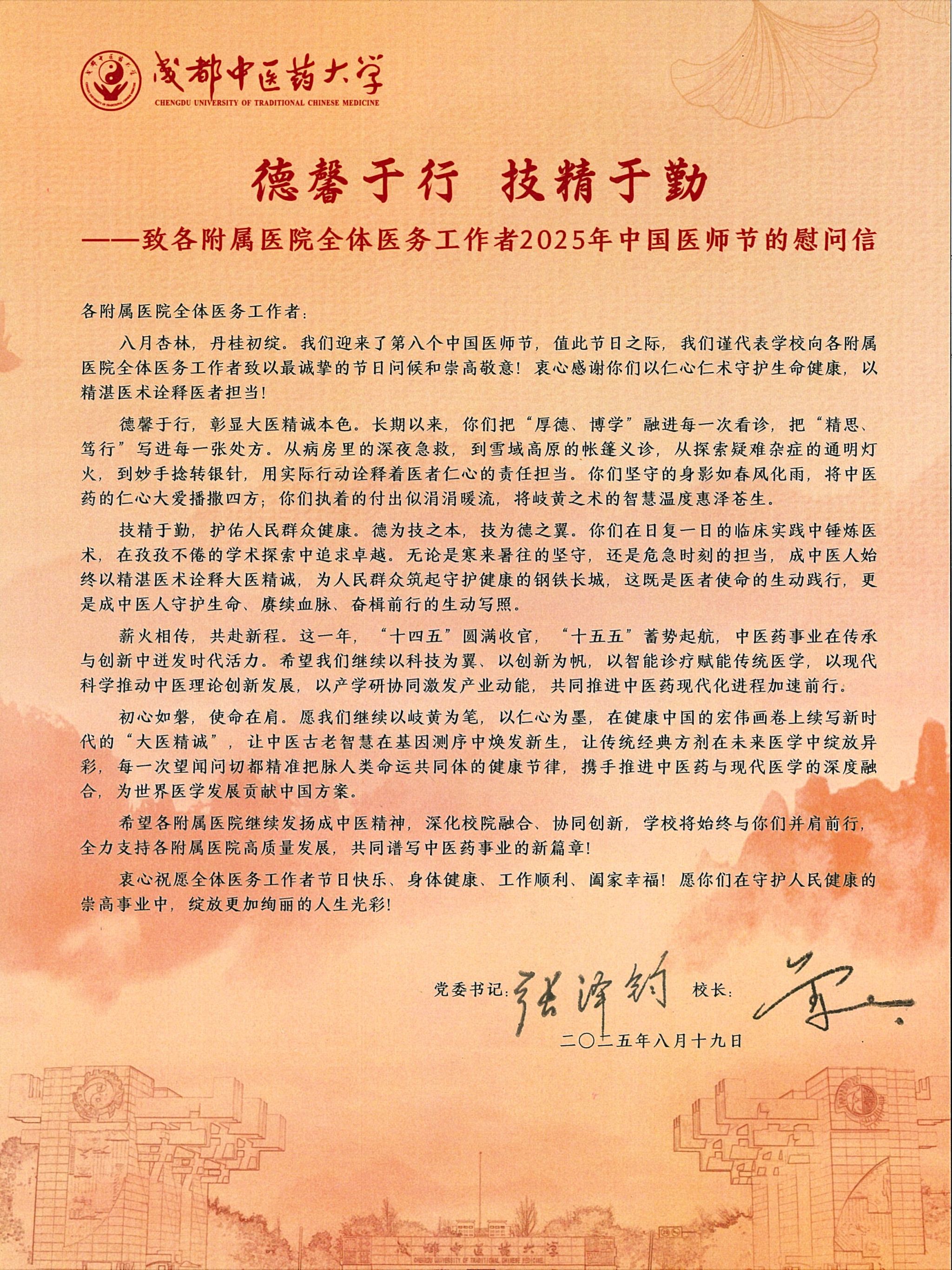 致全体医务工作者2025年中国医师节的慰问信 发布时间:2025-08-18 10:40:57 浏览次数: 次 【字体:小 大】 【打印正文】 上一条:喜讯!Beat365首次上榜世界大学学术排名(ARWU)榜单 下一条:天府永安湖实验室组建方案通过专家论证