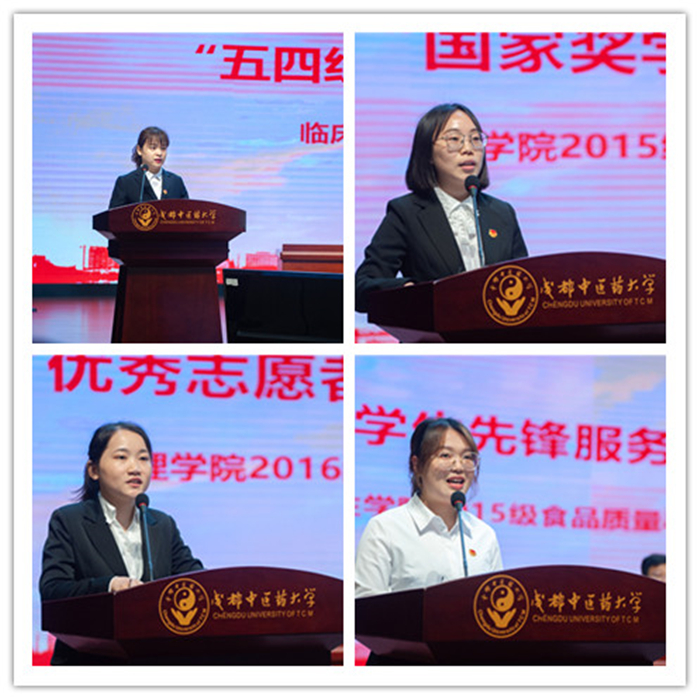 临床医学院分团委朱昕昀老师、药学院学生吴婷婷、护理学院学生谢义茜、公共卫生学院学生蒋佳洛分别作为五四红旗团委、国家奖学金、 优秀志愿者获奖代表以及学生先锋服务岗代表做了事迹分享。