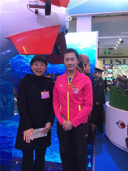在各展区中,特色体验区的参观代表最多,人来人往,熙熙攘攘,好多项目体验需要排长队,但大家都非常希望能亲身感受一下。“复兴号”动车组、“蛟龙”号载人潜水器、“天眼”等模型前,吸引了众多参观者。在“蛟龙”号载人潜水器模型前,同是党代表的潜水员唐嘉陵作现场讲解,大家争相与他合影,并获得他赠送的“蛟龙号”完成西北太平洋海域科考任务返港的纪念首日封。非常幸运的是,我在参观现场还遇到了乒乓球大满贯世界冠军丁玲,并与她合影留念。