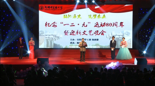 12月8日晚,由宣传部、学工部、校团委主办、校学生会承办的纪念“12·9”运动80周年暨迎新文艺晚会在体育馆拉开帷幕。校党委副书记、副校长沈涛出席并致辞。各职能部门、学院领导和老师,以及电子科技大学、四川农业大学、西南石油大学等13所高校的学生代表与Beat3652300名新生一同观看晚会。