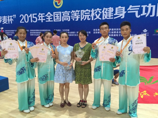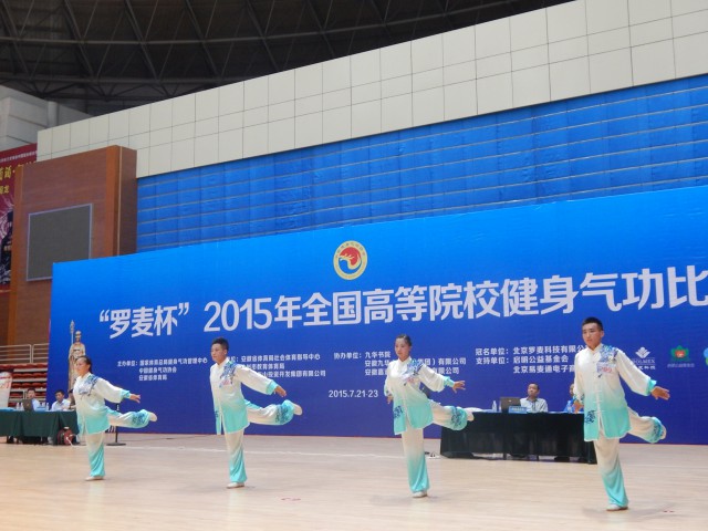 7月20日至24日,2015年全国高等院校健身气功比赛在国家体育总局健身气功培训基地安徽省池州市九华山拉开帷幕,来自北京体育大学、上海体育学院等91所高校的450名参赛人员参加了易筋经、五禽戏、六字诀、八段锦4种健身和竞赛功法的集体和个人项目比赛。