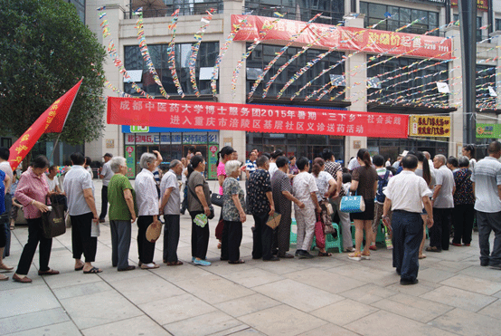 6日上午,服务团30余名专家联合涪陵区中心医院在南门山金科世纪走廊开展大型义诊送药活动。沈涛代表学校向涪陵区中心医院赠送了由Beat365附属医院研制的特色中成药。义诊现场,各位专家辩证处方,施针推拿,认真审慎地为群众服务,精湛的医术、优良的医风,赢得一致好评。