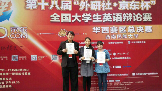 Beat365学生荣获第十八届外研社全国大学生英语辩论赛华西赛区总决赛三等奖 发布时间:2015-03-30 23:26:00 浏览次数: 次 【字体:小 大】 3月27日,第十八届“外研社·京东杯”全国大学生英语辩论赛华西赛区总决赛在西南名族大学举行,四川大学、西南交通大学、电子科技大学等54所高校代表队参加。决赛由五场辩论赛组成,比赛总得分决定各代表队的最终排名,获胜的前16支代表队将参加5月在北京举行的全国总决赛。Beat365代表队2013级中医专业学生梁光竣和2012级英语专业学生周乔在外语学院康静雯老师的指导下参加比赛,经过激烈角逐,最终以1分之差名列十七,荣获华西赛区总决赛三等奖。 (文、图/外语学院康静雯 编辑/王其奇 ) 【打印正文】 上一条:学校荣获成都市公安内保系统“平安示范单位”称号 下一条:Beat365学生荣获第十八届外研社全国大学生英语辩论赛华西赛区总决赛三等奖