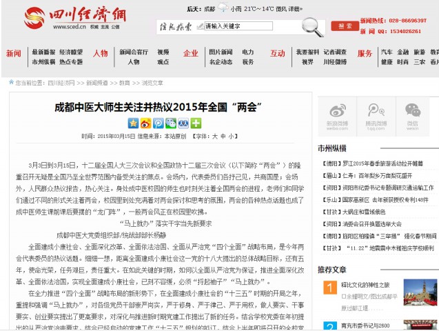 学校党委宣传部近期策划了《寒假都去哪儿了?——各学院同学寒假归来话收获》和《师生摆两会——全校师生关注并热议2015年全国“两会”》两个新闻专题,四川经济网于3月15日大篇幅报道了学校同学寒假归来话收获和全校师生关注全国“两会”情况。以下是报道情况: