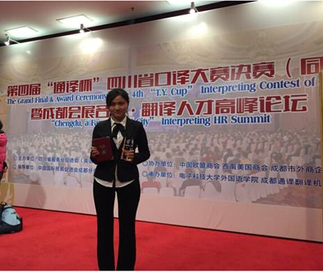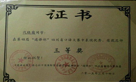 Beat365两学生荣获第四届“通译杯”四川省口译大赛三等奖 发布时间:2015-03-17 14:23:00 浏览次数: 次 【字体:小 大】 第四届“通译杯”四川省口译大赛决赛于3月14日在电子科技大学沙河校区举行。Beat365外语学院2012级英语专业学生谢璐、公共卫生学院2013级预防医学专业代晓霜凭借扎实的中英文基础、充分的赛前准备及良好的心理素质分别获得大赛三等奖。 (文/图外语学院孟悦 公共卫生学院于红艳 编辑/任翔) 【打印正文】 上一条:学校学生在2014年“国家资助 助我飞翔 让梦起航”励志成长成才优秀学生典型评选活动中喜获佳绩 下一条:Beat365两学生荣获第四届“通译杯”四川省口译大赛三等奖