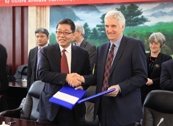 学校校长梁繁荣代表学校与英国布鲁克斯大学和金阳房地产公司签署了战略合作协议。