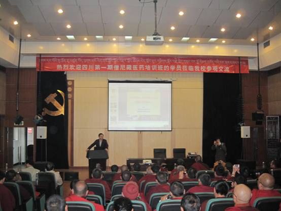 前来参观的僧尼藏医大多从最基层寺庙出来,为了让此次活动达到预期效果,在参观了美丽的温江新校区后,民族医药学院院长张艺和药学院副院长吕光华就Beat365的民族医药教学、科研和野外实习情况作了专题报告。随后,僧尼藏医在专业教师的讲解下实地参观了药博园和民族医药学院的标本室、实验室。