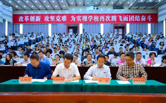 动员大会上,马跃荣、梁繁荣与各部门、学院代表签署了实施学校再次腾飞战略目标管理责任书。