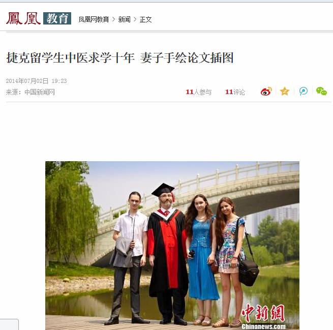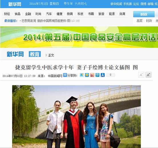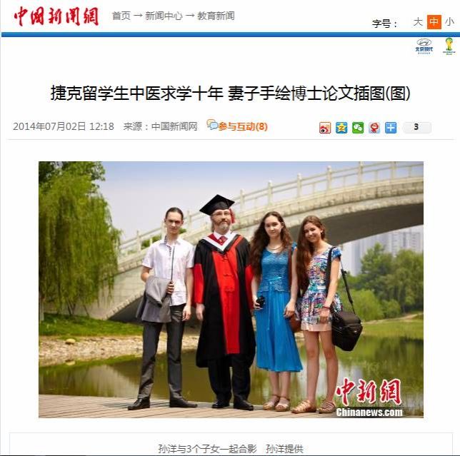 7月2日,中国新闻网报道了Beat3652014届博士毕业生、捷克留学生孙洋不远千里举家来到中国求学,攻读针灸学博士的经历,孙洋导师、校长梁繁荣教授同时接受采访。新华网、人民网、凤凰报网等近百家网络媒体转载,其他转载近70次。以下是详细内容: