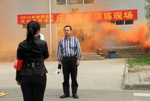 中午13时,在总指挥 “演练开始”的指令下,模拟“火灾烟雾”腾空而起,3号实验楼道内响起急促的警报声,预示发生紧急情况。此刻,正在实验室上课的230余名学生立即停止上课,在任课教师和现场安全引导员的指挥下,用毛巾、围巾等捂住口鼻快速有序地撤离到室外的空旷地带,以班级为单位集结并清点人数。整个应急疏散演练活动用时两分钟零十秒,演练现场无意外事故发生,达到预期的演练目的。