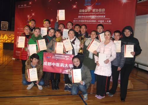 12月20日,由北京市联合国教科文组织协会、IDSU国际运动舞蹈联盟主办的2013年国际学生运动舞蹈(中国区)大赛在成都信息工程学院隆重展开。来自首都体育大学、江西师范大学、成都体育学院研究生院、西华大学、西南石油大学、武汉商学院、华中科技大学、四川师范大学等78个参赛单位的2613人参加大赛。经过三天的激烈角逐,由邓建华老师、郑贞老师带领的Beat365体育舞蹈代表队在比赛中脱颖而出,获得五金两银一铜的好成绩,为学校争得荣誉。