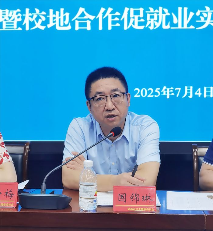 国锦琳代表学校感谢成都市卫健委搭建学生优质实践平台,希望全体实习生珍惜实践机遇,将课堂所学应用于实际工作,在实践中精进专业能力,展现成中医学子良好风貌。他强调,此次基地共建是深化校地合作、拓宽学生就业渠道的关键举措,希望双方以此为新起点,持续探索人才培养与输送的创新模式,实现人才培养与岗位需求的精准对接。