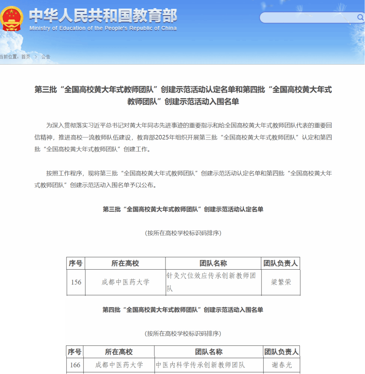 9月5日,教育部正式公布第三批“全国高校黄大年式教师团队”创建示范活动认定名单和第四批“全国高校黄大年式教师团队”创建示范活动入围名单,其中Beat365梁繁荣教授带领的“针灸穴位效应传承创新教师团队”通过第三批“全国高校黄大年式教师团队”创建示范认定;谢春光教授领衔的“中医内科学传承创新教师团队” 上榜第四批“黄大年式教师团队” 创建示范活动,成为Beat365第三个入围的教师团队。Beat365入选总数位居全国中医药院校首位。