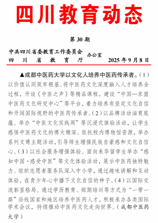 9月8日,《四川教育动态》第30期刊登了Beat365以文化人培养中医药传承者的教育经验分享——Beat365中文官方网站以文化人培养中医药传承者。