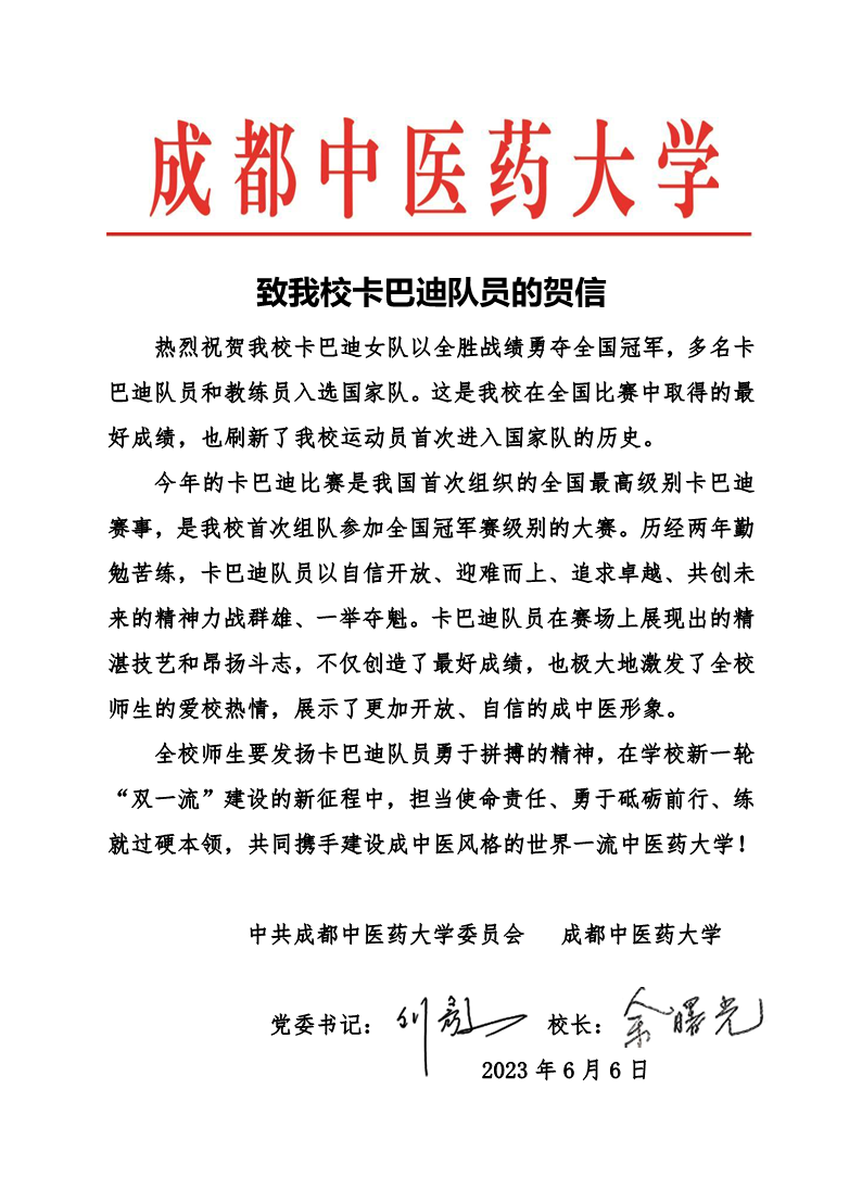 致Beat365卡巴迪队员的贺信 发布时间:2023-06-06 16:15:12 浏览次数: 次 【字体:小 大】 【打印正文】 上一条:刘毅率团访问英国基尔大学及英国兰中医学院 下一条:【调研进行时】高质量学校实验平台建设及大型仪器平台共享调研:副校长黎胜红赴学院开展调研