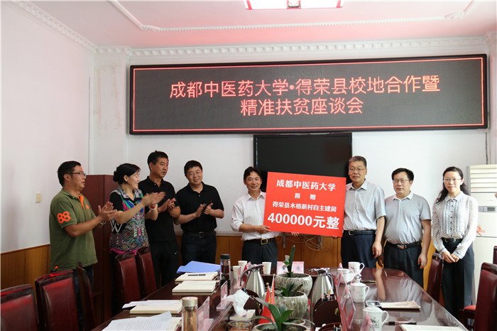为帮助木格村自主建房工程,学校将列出专项资金,捐赠人民币40万元。余曙光向廖大洪授木格村自主建房帮扶资金捐赠牌。