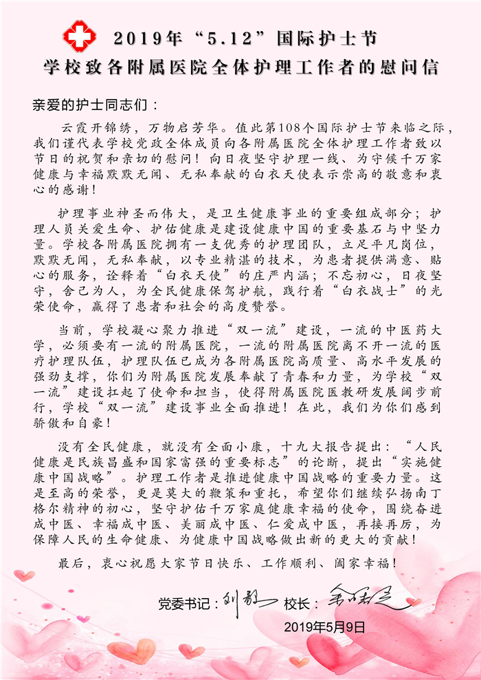 "5.12国际护士节"学校致各附属医院全体护理工作者的慰问信 发布时间:2019-05-09 18:27:00 浏览次数: 次 【字体:小 大】 【打印正文】 上一条:校领导慰问附属医院护理工作者 下一条:Beat365召开2019年春季学期就业工作会