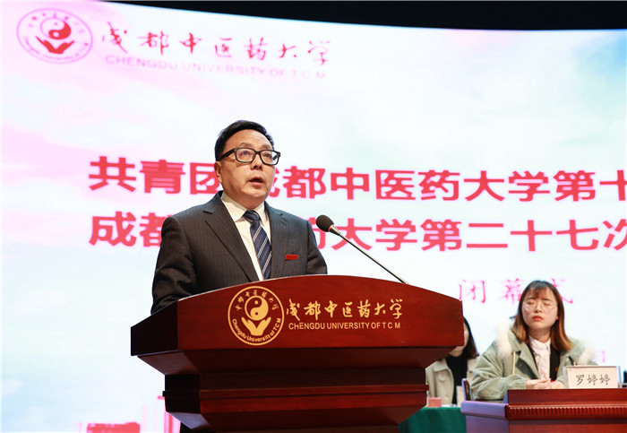 沈涛致大会闭幕词,他指出,习近平总书记的青年工作重要思想为新时期做好团学工作指明了方向,提出了明确要求,我们要深入学习贯彻落实。当前,学校在全面推进“双一流”建设,步入了发展攻坚的重要历史时期,躬逢其盛的成中医青年倍感骄傲,自当奋发努力,以服务大局、服务青年成长成才为己任,不断提高自身思想道德素质和科学文化素质。他强调,各级共青团、学生会组织一定要坚定理想、凝心聚力,始终保持共青团工作的正确方向;一定要夯实基础、创新思路,不断加强共青团自身的建设;一定要围绕中心、服务大局,团结带领广大团员青年为学校“双一流”建设贡献力量;一定要立足现实、发挥优势,不断提升共青团组织服务青年工作的水平。他希望,各位代表回到学院和班级以后,在同学中积极传达大会精神,在学习工作实践中认真贯彻大会决议,带领全校团员青年学生圆满完成大会提出的各项任务;秉承校训,戒骄戒躁,勤奋学习,努力成才,在团员青年学生中起好先锋模范作用。