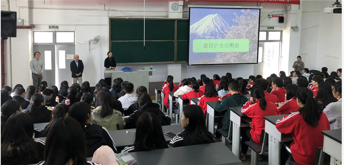 10月25日下午,护理学院在温江校区教学楼召开2018级新生赴日就业项目宣讲会。副院长余雨枫出席会议,北京乐才公司董事长陈江建、经理陈博,学院党政办公室主任沈波、教学科陈霞、2018级全体同学和班级辅导员共计560人参加宣讲会。