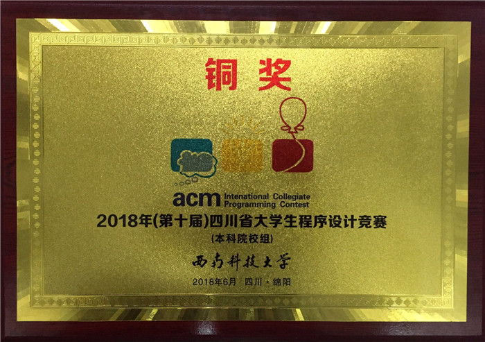 6月1日到3日,由四川省教育厅主办的第十届四川省大学生程序设计竞赛在西南科技大学举行。本届大赛有来自四川大学、电子科技大学、重庆大学等47所川渝高校214支队伍800余选手参赛。Beat365医学信息工程学院“百科全书队”“思考者队”两支队伍获得铜奖。这是医学信息工程学院学生首次在四川省大学生ACM比赛中获奖,也是47所参赛院校中唯一的医学院校学生队伍。