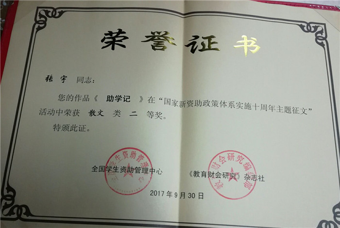 大赛面向全国高校征稿,Beat365资助管理中心积极动员、精心组织学生参赛。经过大赛组委会专家层层严格评审,Beat365公共卫生学院2014级预防医学张宇同学的文章《助学记》以真挚的感情、流畅的文笔、新颖的体裁脱颖而出,获得本次大赛散文类二等奖。