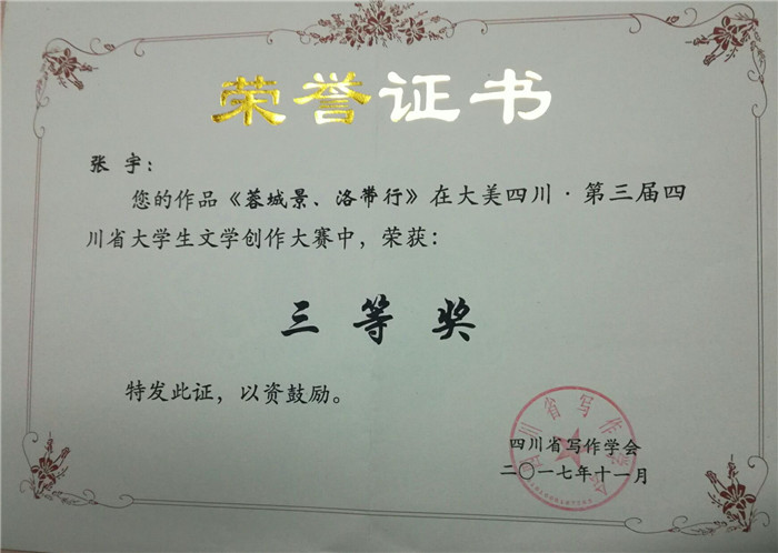 此外,张宇同学还以《蓉城景、洛带行》一文在由四川省写作协会举办的“大美四川——第三届四川省大学生文学创作大赛”中荣获三等奖。