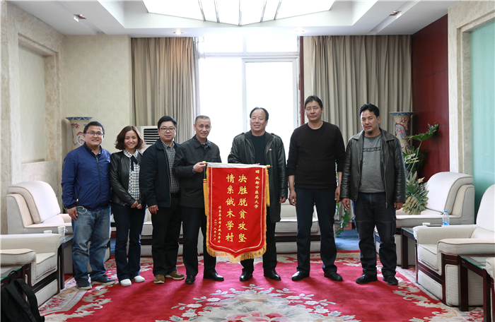 3月28日下午,得荣县奔都乡俄木学村村“两委”干部一行三人来到温江校区,村党支部书记次仁邓珠将印有“决胜脱贫攻坚 情系俄木学村”的锦旗送给Beat365,副校长徐廉代表学校接受锦旗。