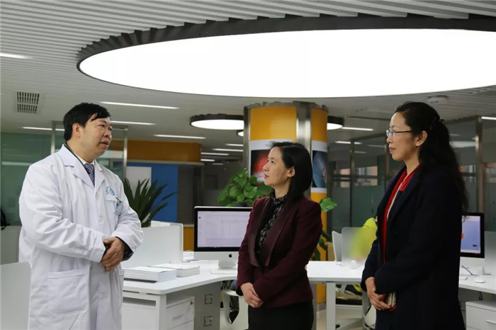 彭翊、杨静一行随后参观了医院眼底读片中心、廖品正国医大师工作室、特检中心、门诊大厅、住院部等。彭翊充分肯定Beat365通过科技成果转化创新创业成功创办医教研三位一体的研究型眼科医院,认为对高校科技人员创新创业具有示范作用。