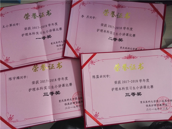 12月19日,Beat365在重庆医科大学附属第二医院实习的护理学2014级学生,在参加医院举办的2017-2018学年度护理本科实习生小讲课比赛中获得好成绩。