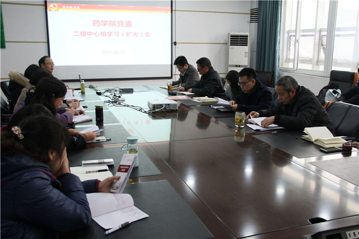12月12日下午,药学院党委召开二级中心组学习会暨党委扩大会,组织学习学校第二次党代会精神。学院领导班子成员、党委委员、纪委委员、党支部书记及各系(所)中心主任、党政科室负责人等参加学习会。会议由学院党委副书记胡媛主持。