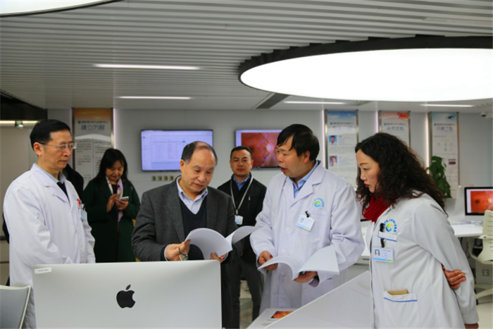 方明金一行参观了附属银海眼科医院门诊大厅、廖品正国医大师工作室、眼科门诊、住院部、特检部、眼影像分析与诊断中心等。参观过程中,方明金对医院精尖的医疗设备、精湛的专家队伍、专业的医务人员、体贴的医疗服务以及舒适的就医环境给予了高度肯定。