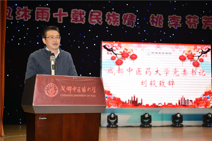 刘毅发表讲话,充分肯定民族医药学院的发展成就,希望学院认真学习贯彻党的十九大精神,以习近平新时代中国特色社会主义思想为指导,贯彻落实今年施行的中医药法,切实做好少数民族医药工作,推动中医药振兴发展。以建院十周年为契机,坚持党的教育方针,不断深化教育改革,围绕健康中国目标,精准对接新时代人民健康需求,继续提高办学质量,把少数民族医药作为中医药事业重要组成部分统筹推进,为民族医药的发展培养出更多德才兼备的人才,为学校“双一流”建设作出更大的贡献,与学校一起迎来更加辉煌灿烂的明天。