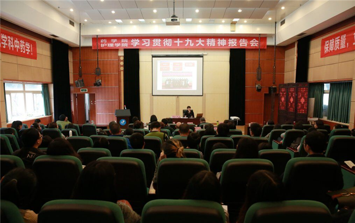 为引领广大师生深入学习党的十九大报告,掀起学习十九大报告的热潮,11月2日下午,药学院党委与护理学院党委在科技楼学术报告厅联合举办十九大精神学习报告会,党的十九大代表、药学院党委委员、中药药理学系主任曾南作《不忘初心,牢记使命》主题报告。校党委书记刘毅,副校长杨静,药学院、护理学院全体科以上干部、支部书记、教职工党员、学生党员、民主党派和无党派人士代表共聚一堂,畅谈学习十九大精神心得体会和切身感悟。报告会由药学院党委书记刘世云主持。