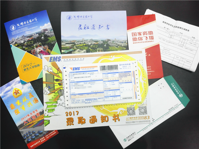 据招生就业处处长叶军介绍,新生录取特快专递内装有2017级新生录取通知书、2017级新生手册、银行卡以及入伍指南、助学贷款简介等材料。录取工作正在进行中,暂未收到录取通知书的考生,可在Beat365招生信息网站:http://zs.cdutcm.edu.cn/“录取结果查询”栏目中查询详细录取情况。