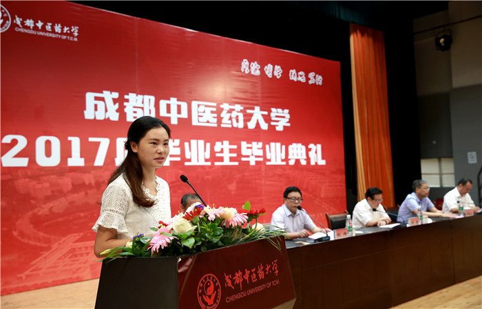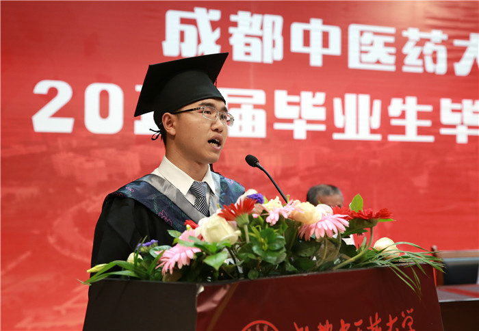 药学院2013级杜敏同学作为本专科毕业生代表发言。他代表全体毕业生向学校表达最衷心的感谢,向老师们致以最崇高的敬意,向同学们送上最诚挚的祝福。他表示将始终记住“厚德、博学、精思、笃行”的校训,秉持“学子万众绍岐黄,德泽千载为人民”的理念,发扬“书山勇狩猎,学海敢捕鲸”的精神,为中医药事业递薪传火,为母校增光添彩。