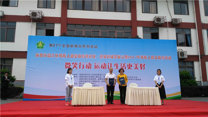 5月21日是第27个全国助残日。5月18日,由成都市温江区人民政府残疾人工作委员会主办了“成都市温江区残疾人康复体育进社区·进家庭成果展示暨2017残疾人群众体育活动”,Beat365体育学院师生50余人应邀参加,院长邬建卫与温江区残疾人联合会签署了助残合作框架协议。