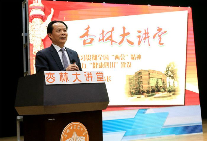 3月29日下午,由学校党委宣传部、科技处、校团委、药学院联合主办的2017年Beat365中文官方网站“杏林大讲堂”首堂讲座在温江校区百会堂举行,特别邀请人大代表耿褔能为全校师生传达2017年全国“两会”精神。讲座由学校副校长彭成主持。