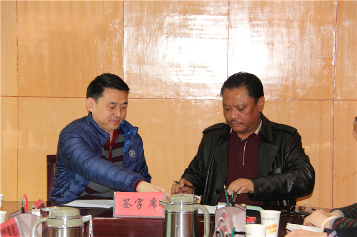 王礼均、吴先斌分别代表四川省中药饮片有限责任公司、成都地奥集团天府药业股份有限公司与得荣县环境保护与林业局副局长张勇签订得荣县花椒收购帮扶协议。签字仪式结束后,校、县双方就推进精准扶贫工作进行深入交流。