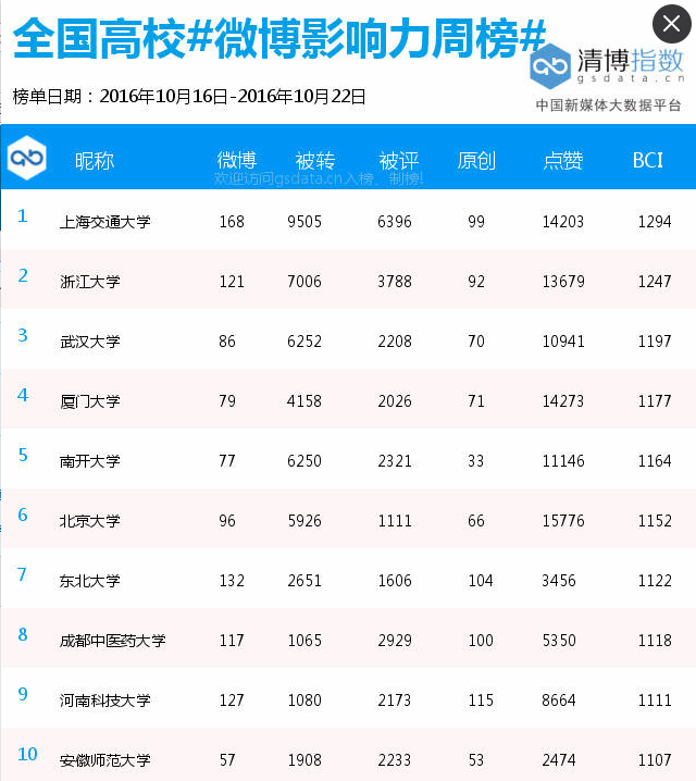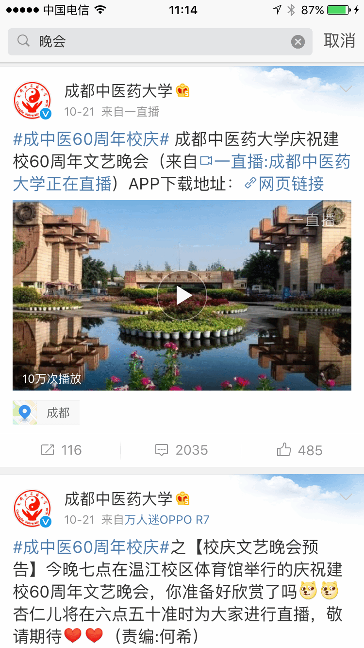 学校官方微博在全国高校微博影响力周榜中位居第八(2016.10.16—2016.10.22) 发布时间:2016-10-26 11:21:00 浏览次数: 次 【字体:小 大】 10月21日晚,学校官方微博直播了庆祝建校60周年文艺晚会,当晚收看直播人数达到10万人次,评论2035条, 转发116条。 (编辑/任翔) 【打印正文】 上一条:学校官方微博在全国高校微博影响力周榜中位居第八(2016.10.16—2016.10.22) 下一条:Beat365成功承办首届国际中医药肿瘤论坛