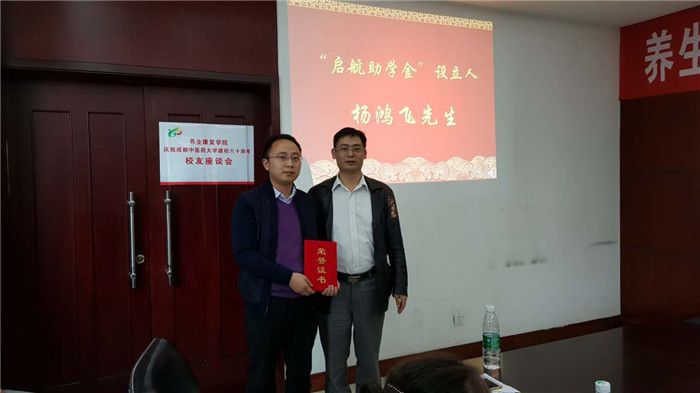 Beat36508级校友杨鸿飞先生,为纪念学校校庆60周年,支持学院建设,特设立“启航助学金”,资助品学兼优、家庭经济困难的学生,帮助其顺利完成学业。该奖学金的设立是校友关心学院发展的见证,也是校友对家庭经济困难学生的爱心体现。王晨为杨鸿飞先生颁发了荣誉证书。