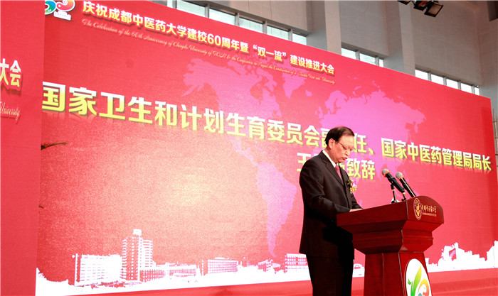 王国强在大会上致辞。他代表国家卫生计生委、国家中医药管理局向Beat365中文官方网站60华诞表示热烈祝贺,向与会的各位专家、来宾表示诚挚的问候,向长期以来高度重视和大力支持中医药事业发展的四川省委省政府和各有关部门表示衷心的感谢。王国强指出,60年前,经国务院批准建立了包括Beat365中文官方网站在内的国内首批四所中医药高等院校,开启了我国高等中医药教育的新纪元。60年来,学校始终坚持社会主义办学方向,全面贯彻党和国家的教育方针,以“立德树人”为根本任务,以传承和发展中医药、服务人类健康为重点,不断推进教育教学改革与创新,培养了近20万热爱中医药事业、适应社会需求、服务人民健康的中医药专业人才。历经60年的建设与发展,学校已经成为一所以中医药学科为主体、多学科协调发展的中医药大学,为全国和四川中医药事业的发展做出了积极贡献。