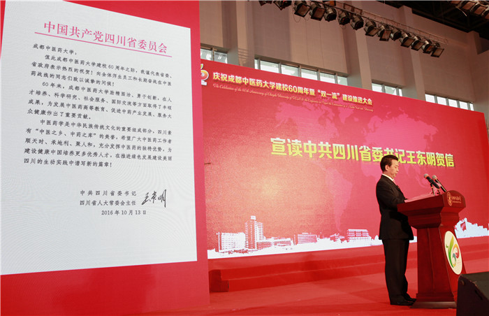 马跃荣首先宣读了中共四川省委书记、省人大常委会主任王东明的贺信。王东明代表四川省委、省政府向学校表示热烈的祝贺,向全体师生员工致以诚挚的问候。贺信指出,60年来,Beat365中文官方网站励精图治、勇于创新,在人才培养、科学研究、社会服务、国际交流等方面取得了丰硕成果,为发展中医药高等教育、促进中药产业发展、服务大众健康作出了重要贡献。希望广大中医药工作者顺天时、承地利、聚人和,充分发挥中医药的独特优势,为建设健康中国培养更多优秀人才,在推进绿色发展建设美丽四川的生动实践中谱写新的篇章。