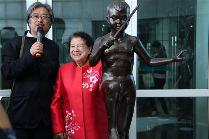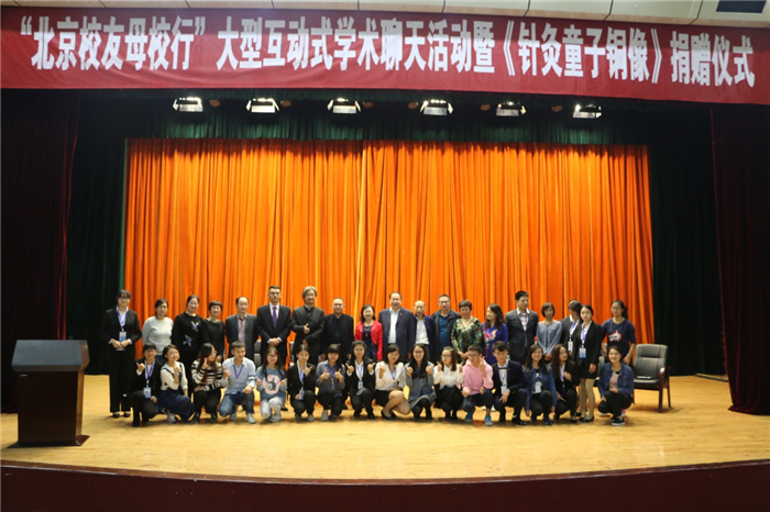针灸童子揭幕仪式中,北京校友会会长毛嘉陵祝贺Beat365中文官方网站建校六十周年,并对《针灸童子》的意义进行解说。