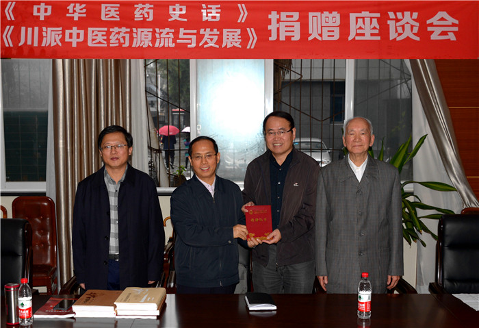 座谈会由彭成副校长主持。两本书的主编杨殿兴教授介绍了主创人员的基本情况和编写情况,总结了《中华医药史话》的四大特点:以史传史;以人代诗;诗书画意墨韵;立足全国、突出四川;阐述了《川派中医药源流与发展》的四个特色:从源到流;既注重人又注重作品;医药并重;填补了多学派的空白。梁繁荣校长代表学校对本次捐赠书籍的校友和编写组成员表达了诚挚的感谢,对两本书的内容给予了高度评价,肯定了这两本书对中医药文化及川派中医药发展的巨大贡献。座谈会上,各编委及主创人员和学校相关职能部门相互交流,提出了许多有利于学校下一步中医药文化建设的意见和建议 。