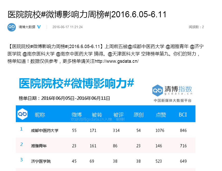 学校官方微博在医院院校微博影响力周榜中位居首位(6.05-6.11) 发布时间:2016-06-17 11:26:00 浏览次数: 次 【字体:小 大】 (编辑/任翔) 【打印正文】 上一条:学校官方微博在医院院校微博影响力周榜中位居首位(6.05-6.11) 下一条:学校中医眼科学与中医耳鼻咽喉科学博士、硕士学位研究生二级学科自主设置论证会顺利召开