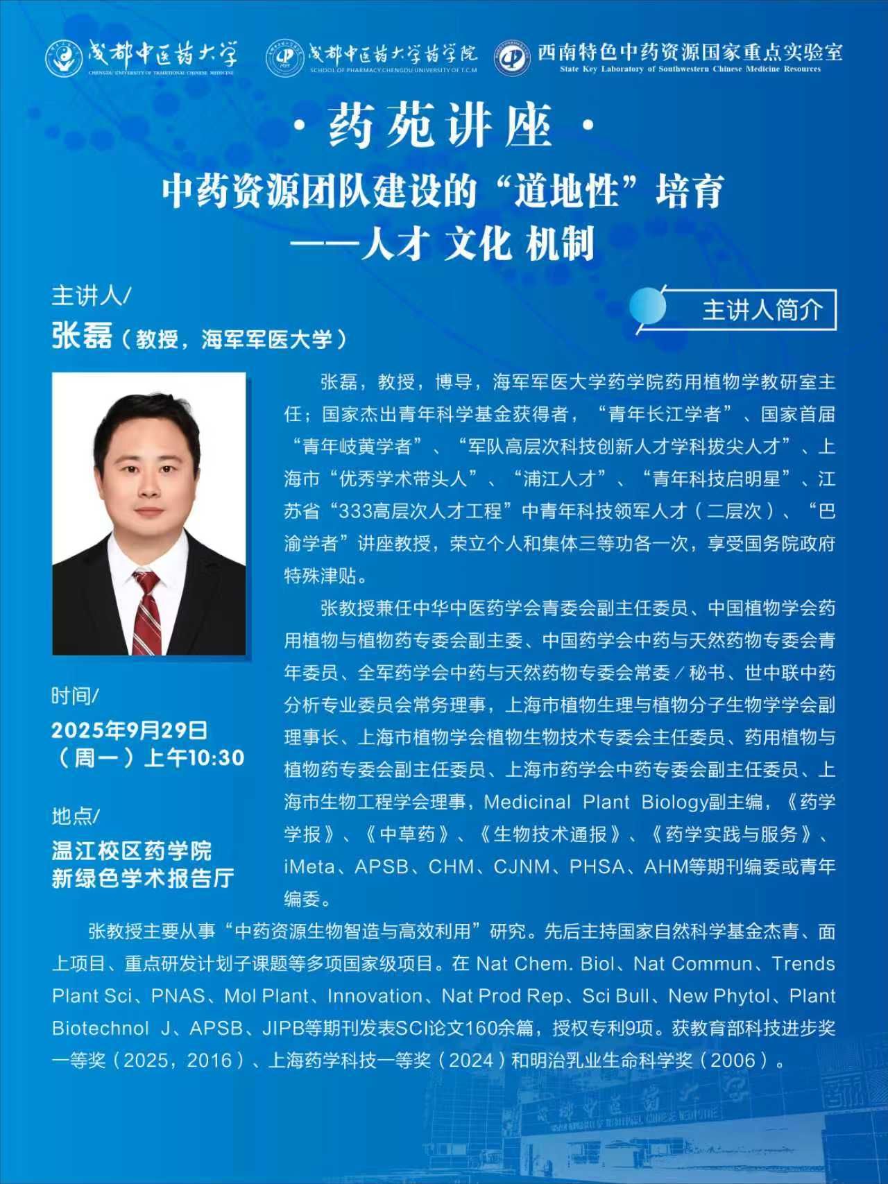 会议预告丨药苑讲座 发布时间:2025-09-28 15:49:17 浏览次数: 次 【字体:小 大】 题 目:中药资源团队建设的“道地性”培育——人才 文化 机制时 间:2025年9月29日(星期一) 上午10:30地 点:温江校区药学院新绿色学术报告厅主讲人:张 磊 海军军医大学主 办:Beat365中文官方网站 Beat365中文官方网站药学院 西南特色中药资源国家重点实验室 【打印正文】 上一条:会议预告丨2025年中药制剂大会 暨世界中医药学会联合会中药新型给药系统专业委员会第十五届学术年会、 世界中医药学会联合会中药药剂专业委员会第十九届学术年会、 中华中医药学会中药制剂分会第二十五届学术年会 会议通知(第三轮) 下一条: 学术成果丨Beat365学者构建基于AI与知识图谱的中医药多维数据挖掘与机制解析平台