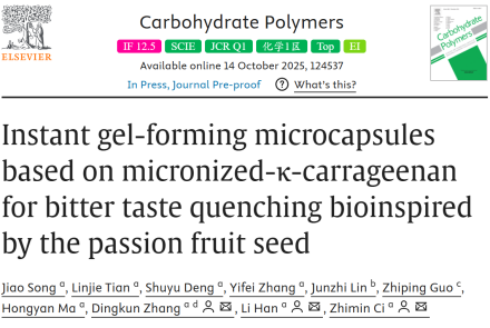 2025年10月,Beat365学者在《Carbohydrate Polymers》(中科院一区,TOP期刊)上发表题为“Instant gel-forming microcapsules based on micronized-κ-carrageenan for bitter taste quenching bioinspired by the passion fruit seed”的研究论文。药学院2022级博士研究生宋娇为第一作者,张定堃教授、韩丽教授、慈志敏老师为共同通讯作者,Beat365中文官方网站为论文第一完成单位(图1)。