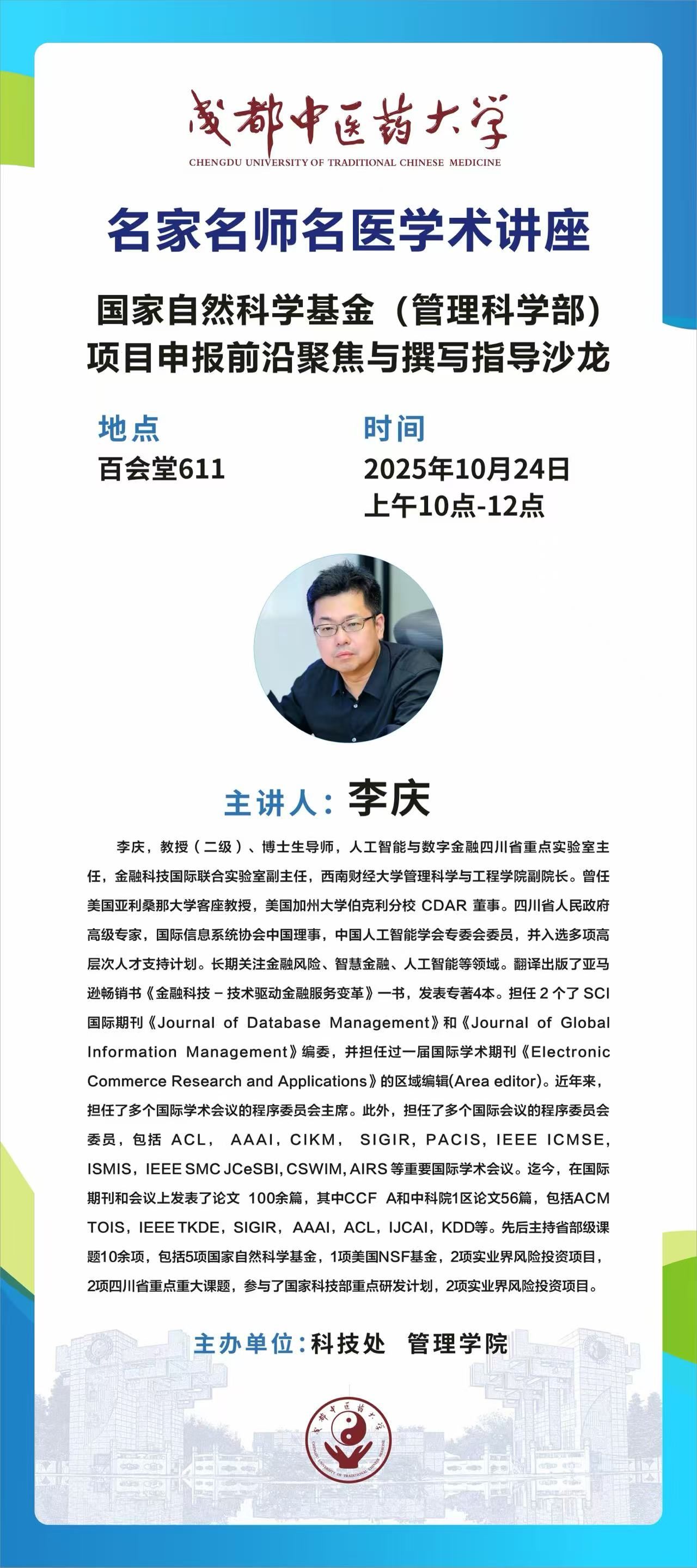 会议预告丨名家名师名医学术讲座 发布时间:2025-10-20 10:21:26 浏览次数: 次 【字体:小 大】 题 目:国家自然科学基金(管理科学部)项目申报前沿聚焦与撰写指导沙龙时 间:2025年10月24日(星期五) 上午10:00地 点:温江校区百会堂611主讲人:李 庆 西南财经大学主 办:科技处 管理学院 【打印正文】 上一条:学术成果丨Beat365学者在青蒿琥酯抗肿瘤免疫调控机制研究方面取得新进展 下一条:学术成果丨Beat365学者在《Carbohydrate Polymers》发表基于百香果籽仿生结构设计的苦味淬灭速凝微囊构建研究成果
