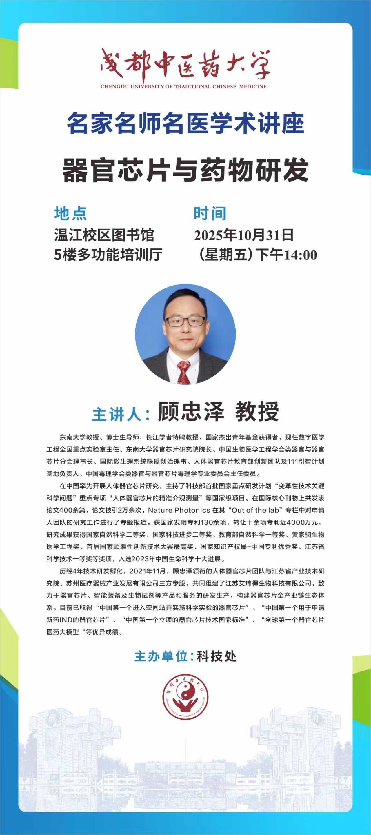 会议预告丨名家名师名医学术讲座:器官芯片与药物研发 发布时间:2025-10-28 16:52:02 浏览次数: 次 【字体:小 大】 题 目:器官芯片与药物研发时 间:2025年10月31日(星期五) 下午14:00地 点:温江校区图书馆5楼多功能培训厅主讲人:顾忠泽 东南大学主 办:科技处 【打印正文】 下一条:没有了! 下一条:会议预告丨名家名师名医学术讲座:纳米生物材料与纳米药物构建