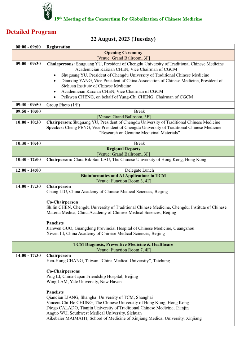 The 19th CGCM Meeting is going to be held at Felton Hotel Chengdu, Sichuan on August 21 - 25, 2023 (Monday – Friday). The Meeting is organized by Chengdu University of Traditional Chinese Medicine. It provides a platform for regulatory-industrial-academic exchanges and potential research collaborations on various areas of herbal medicine among our worldwide members and guests.